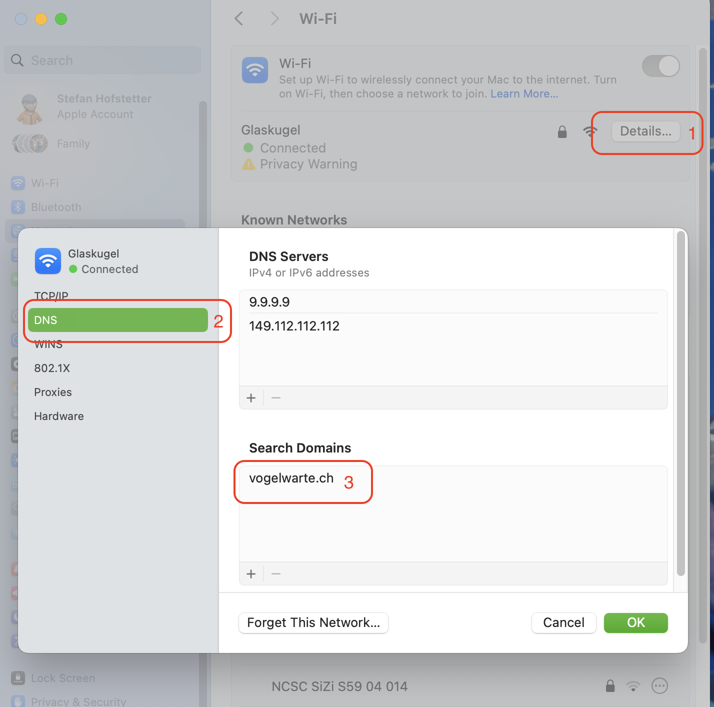 For various internal services, e.g. QGIS plugins, a standard domain vogelwarte.ch must be specified in the network settings.